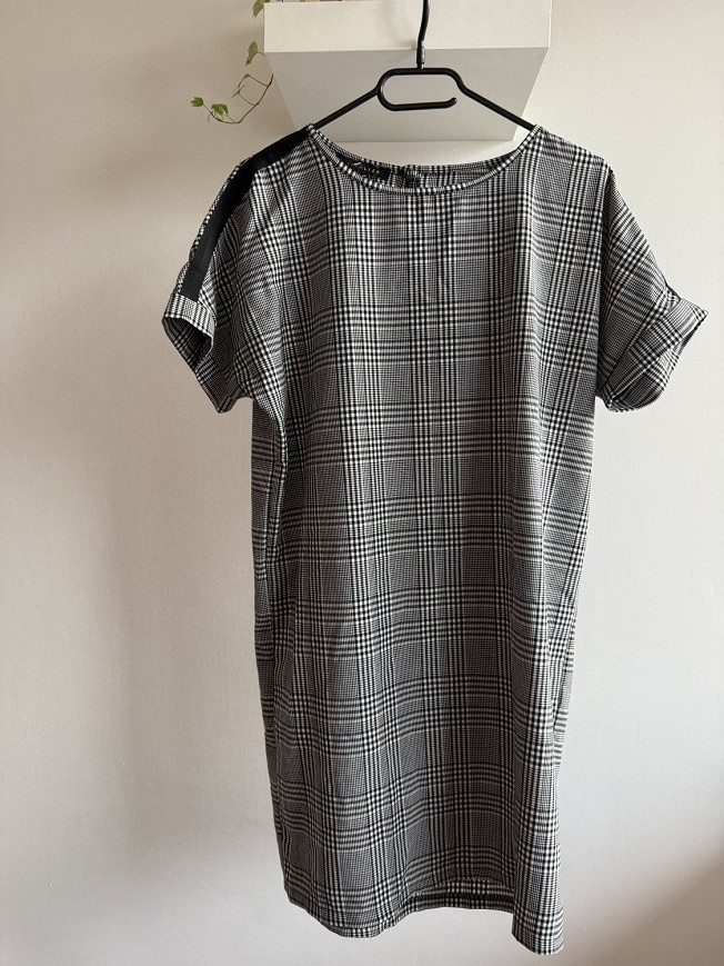 Fekete-fehér kockás ruha letisztult, egyenes fazonnal. Vállán fekete betétes részlettel, ami különlegesebb megjelenést ad. Harisnyával és bokacsizmával igazán stílusos választás.