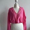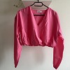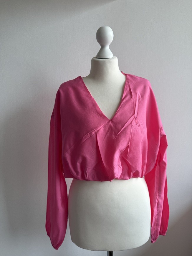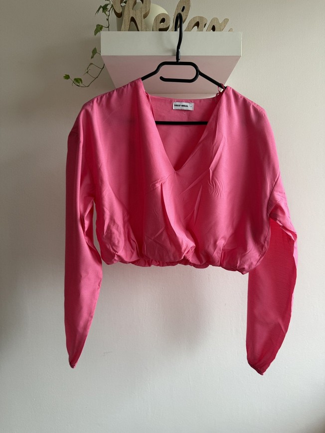 Tally Weijl élénk pink, rövid fazonú blúz, nőies V-kivágással és lenge, könnyű anyaggal. Deréknál gumírozott kialakítása szépen formálja az alakot, így magas derekú nadrággal vagy szoknyával különösen csinos. Igazi feltűnő darab a tavaszi-nyári szettekhez.