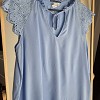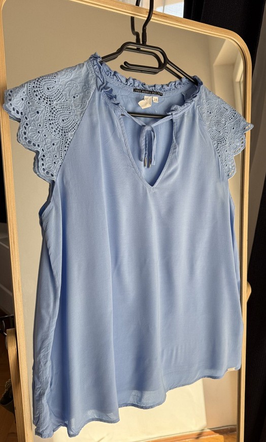Világoskék színű, könnyed esésű felső csipkés vállrésszel. V-nyakú kialakítású, megkötős részlettel a nyaknál, ami nőies megjelenést ad neki. Légies, kényelmes darab, tökéletes a tavaszi-nyári időszakra.