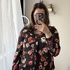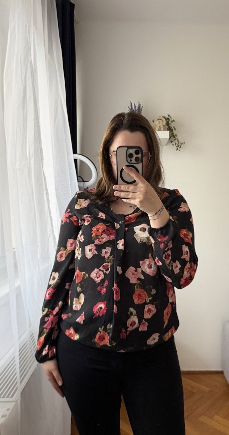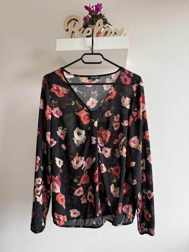 Fekete alapon virágmintás, könnyed anyagú blúz V-nyakú kivágással. Laza, nőies fazon, elegánsabb és hétköznapi szettekhez is jól passzol. Farmerrel, szoknyával vagy akár blézer alá is szuper választás.