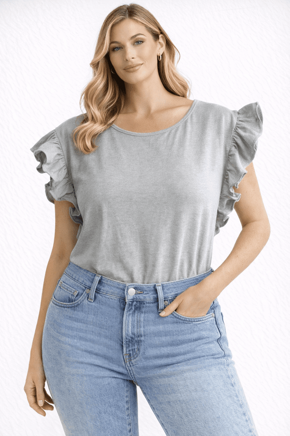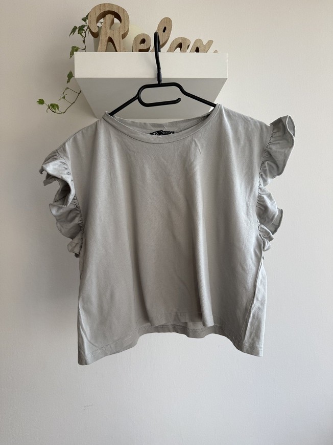 Letisztult, rövidebb fazonú darab dekoratív fodros ujjakkal. Nőies és kényelmes viselet, amely farmerrel vagy magas derekú nadrággal is jól mutat.