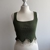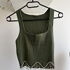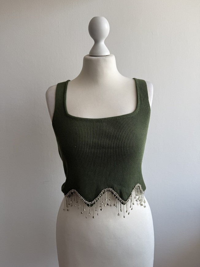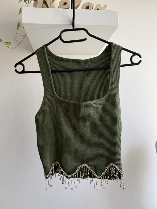 Zöld, bordázott anyagú női felső vastag pántokkal és szögletes nyakkivágással. Az alján különleges, gyöngyös láncdíszítés teszi igazán egyedivé és elegánssá. Csinos választás farmerhez vagy magas derekú szoknyához is. Rugalmas anyagú,nyúlik.