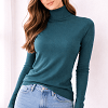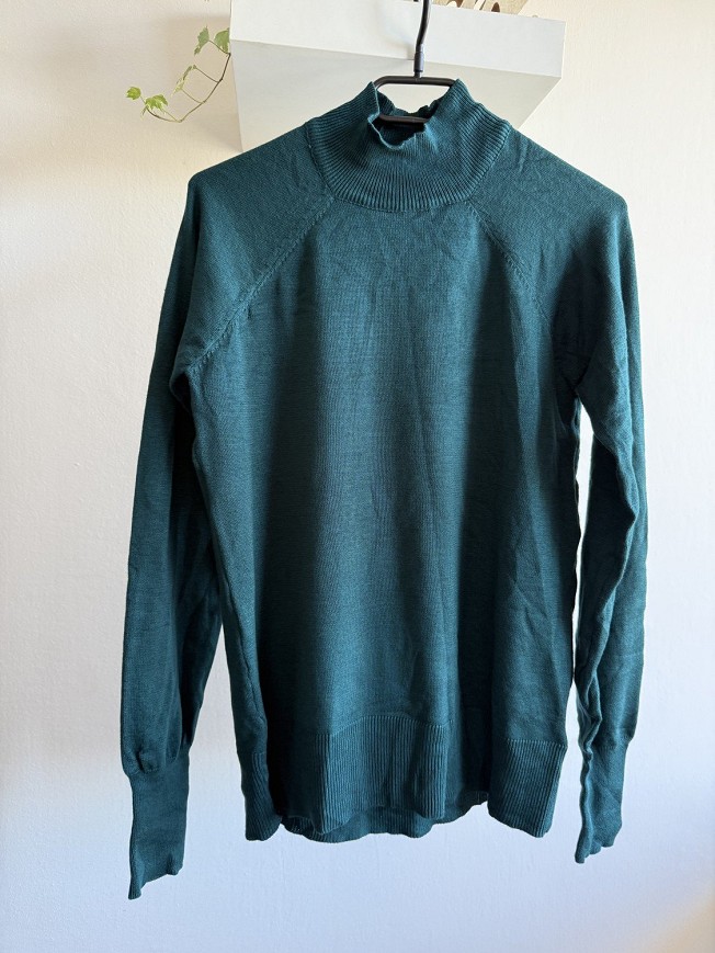 Sötétzöld, finom kötött anyagú női garbós pulóver. Letisztult, klasszikus fazon, amely kényelmes és elegáns viselet a hűvösebb napokra. Bordázott nyakrésszel és alsó passzéval készült, amely szépen tartja a formáját. Farmerrel, szövetnadrággal vagy akár szoknyával is könnyen kombinálható. Használt, szép állapotú darab, időtálló alapdarab a gardróbba.